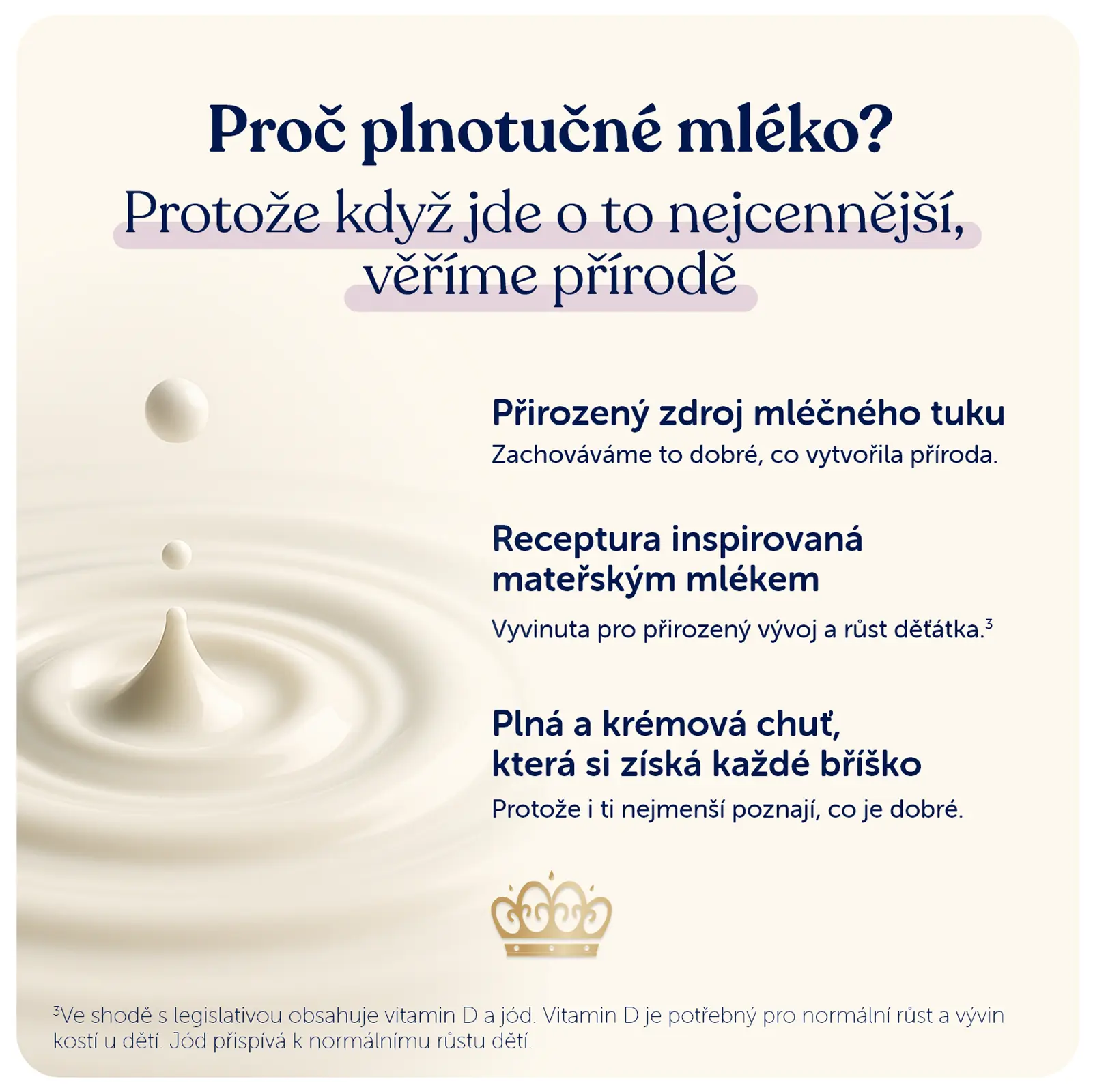 Složení: Plnotučné mléko (107 g tekutého mléka na 100 g prášku), demineralizovaná syrovátková bílkovina (z mléka), rostlinné oleje (slunečnicový, kokosový, řepkový), laktóza (z mléka), sušené odstředěné mléko, galaktooligosacharidy (z mléka) 3 %, koncentrát syrovátkové bílkoviny obohacený o alfa-laktalbumin (z mléka), chlorid draselný, citronan sodný, cholin bitartrát, citrát vápenatý, fruktooligosacharidy 0,2 %, chlorid hořečnatý, fosforečnan vápenatý, mléčnan vápenatý, olej z mikrořas Schizochytrium sp., L-askorban sodný, hydroxid draselný, inositol, L-thyrosin, olej z Mortierella alpina, taurin, nukleotidy (cytidin-5′-monofosfát, sodná sůl uridin-5′-monofosfátu, adenosin-5′-monofosfát, sodná sůl inosin-5′-monofosfátu, sodná sůl guanosin-5′-monofosfátu), L-fenylalanin, pyrofosforečnan železitý, síran zinečnatý, vitamín E, niacin, D-pantothenát vápenatý, síran měďnatý, thiamin, riboflavin, vitamin A, vitamin B6, síran manganatý, jodid draselný, kyselina listová, seleničitan sodný, vitamin K, vitamin D3, biotin, vitamin B12, regulátor kyselosti (kyselina citronová).
